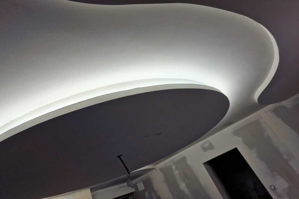 Réalisation d’un plafond courbe en placo avec intégration d’un éclairage indirect, pour apporter du caractère à la pièce et créer une ambiance moderne et soignée.
